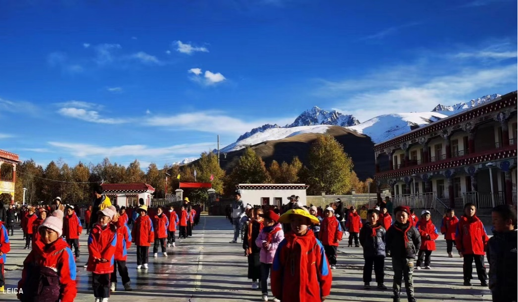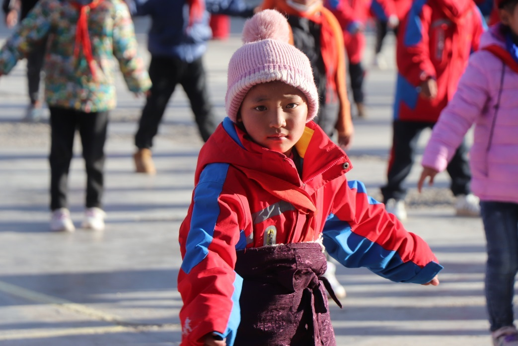 在雪山和陽(yáng)光的沐浴下,孩子們跳著藏族鍋莊來(lái)歡迎遠(yuǎn)來(lái)客人和對(duì)美好生活的歌頌。