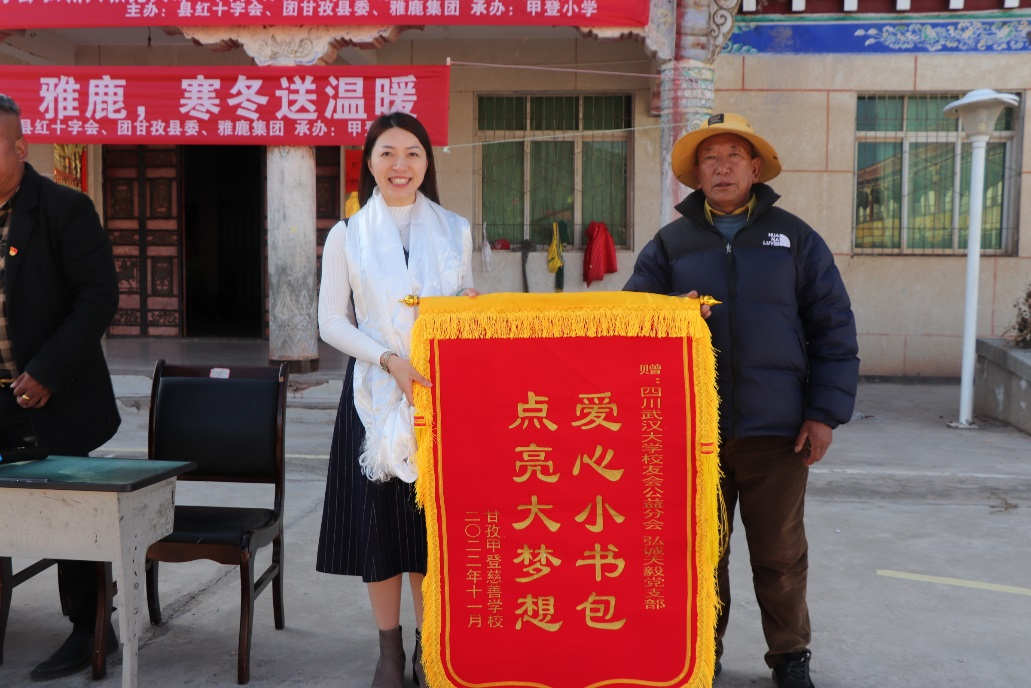 捐贈(zèng)儀式上,四川武漢大學(xué)校友會(huì)公益分會(huì)、弘誠(chéng)天毅公司總經(jīng)理助理趙金香表示“這是一份禮物,也是一種鼓勵(lì),希望你們好好學(xué)習(xí),用知識(shí)改變命運(yùn),改善生活。”同時(shí)也用三個(gè)感動(dòng)來(lái)表達(dá)自己的感情,第一個(gè)是被學(xué)校里在教育戰(zhàn)線上一路往前走的老師所感動(dòng),感謝他們的付出和堅(jiān)守;第二個(gè)是一路走來(lái)感受了甘孜濃厚的文化和壯麗的美景,是對(duì)自己心靈上的洗禮,被當(dāng)?shù)厝嗣竦拇緲闼袆?dòng),希望未來(lái)呼吁有更多的愛(ài)心人士走進(jìn)甘孜;第三個(gè)是被孩子們樂(lè)觀積極的精神狀態(tài)、清澈的眼神所感動(dòng),從媽媽這個(gè)角色來(lái)祝福孩子,希望他們?cè)陉?yáng)光下健康成長(zhǎng),有一個(gè)快樂(lè)的童年。