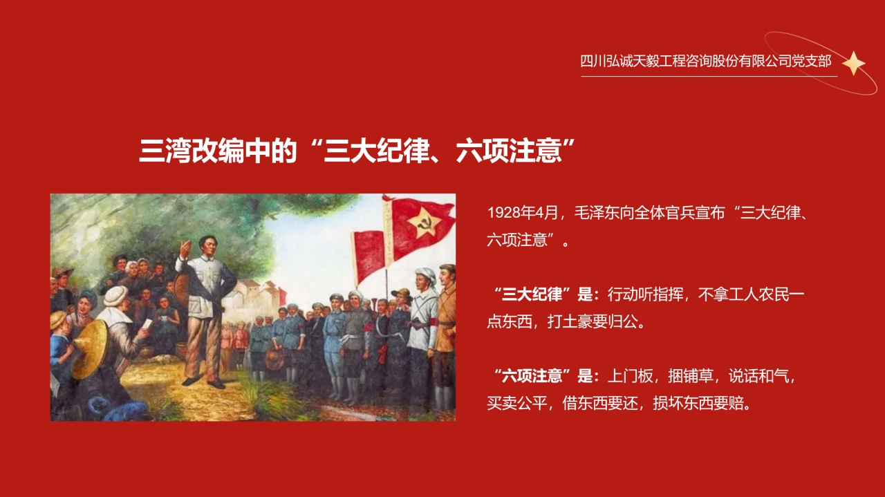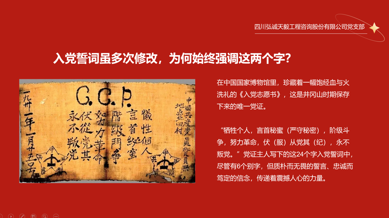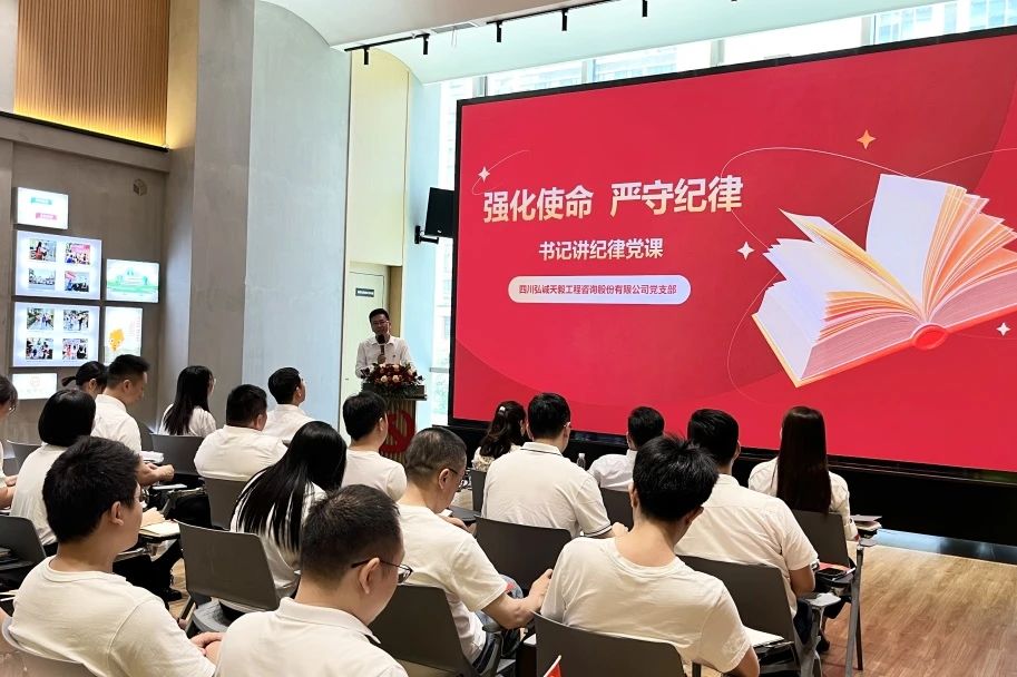 為認真學習貫徹中共中央《關于在全黨開展黨紀學習教育的通知》精神,全面深入推進黨紀學習教育,激勵黨員干部堅守紀律規矩,擔當砥礪前行,更好地發揮基層黨組織戰斗堡壘和黨員干部先鋒模范作用,6月22日,四川弘誠天毅工程咨詢股份有限公司黨支部書記許進同志以“強化使命,嚴守紀律”為題,為全體黨員上了一堂黨紀學習專題黨課。
