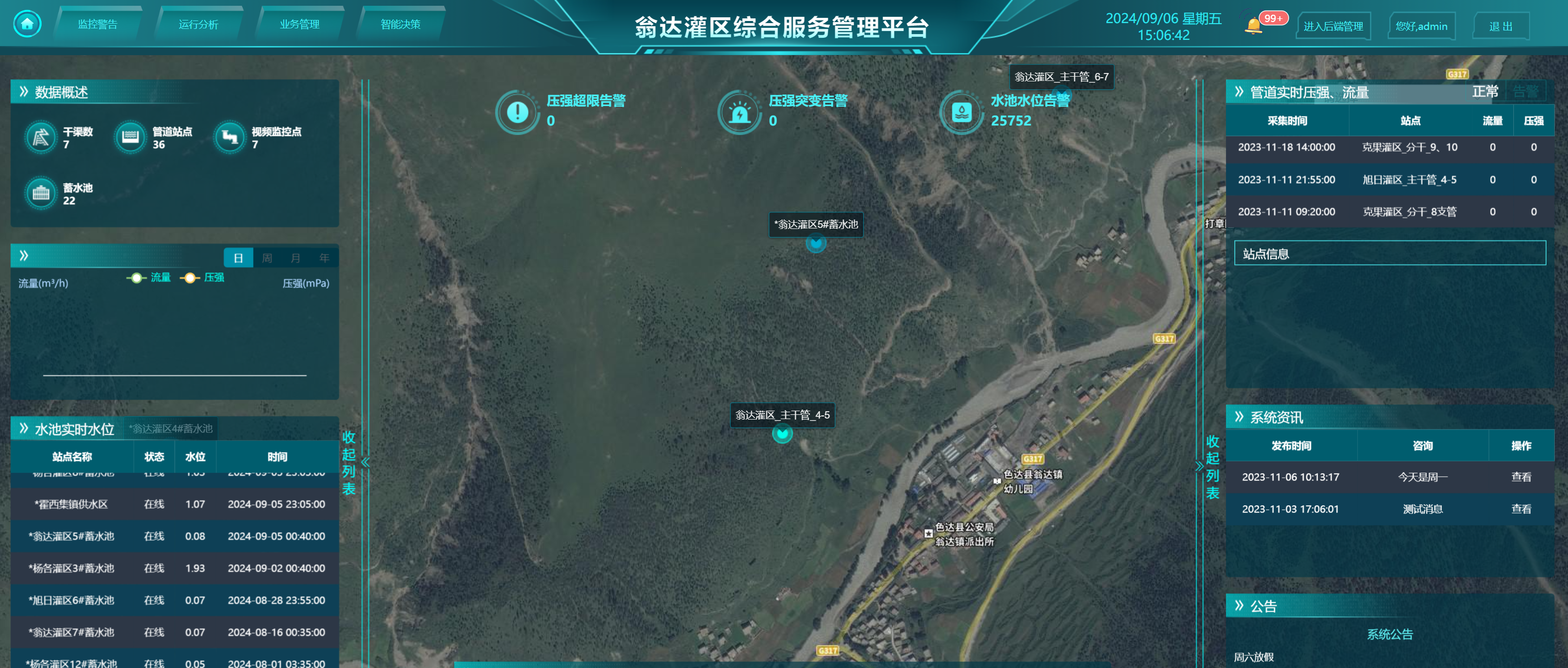灌區信息化管理系統以灌區GIS一張圖為基礎,將灌區的地理信息、管網布局、水資源分布等信息集成在一張圖上,實現對灌區全局的直觀掌控。同時,系統通過實時信息采集,對灌區的管網進行實時監測,確保水流暢通,減少水資源浪費。運用大數據分析和人工智能技術,對管網運行進行風險評估和智能預警,及時發現并處理潛在問題。實現遠程控制閘閥的開關,根據灌溉需求實時調整水流,提高灌溉效率。通過供水指揮調度,合理分配水資源,為農業灌溉提供有力保障。精確計量灌區用水,合理收取水費,促進水資源的高效利用。